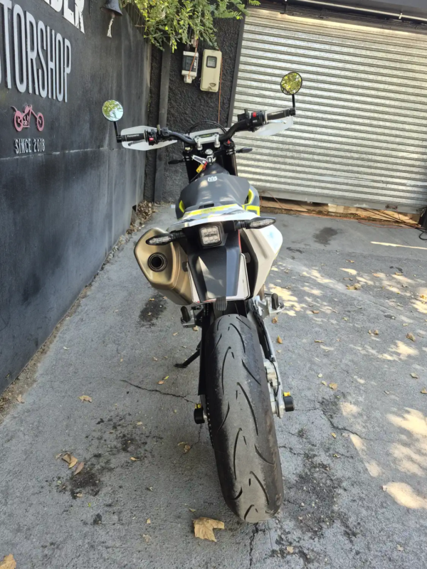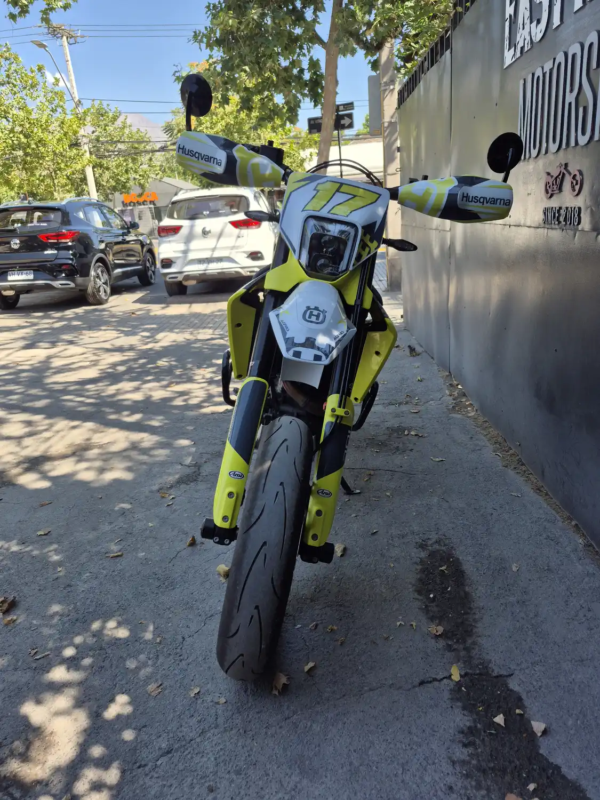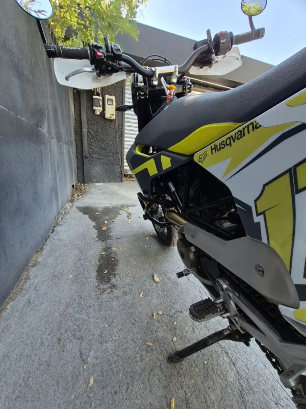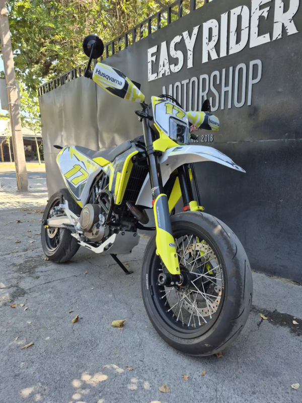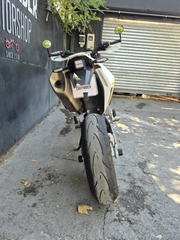 | OBSERVACIONES: | Motor monocilíndrico de 692.7 cc (74 CV, 72 Nm) refrigerado por líquido, con transmisión de 6 velocidades, embrague antirrebote asistido y escape Akrapovič, suspensión WP XPLOR (delantera invertida de 43 mm y trasera monoshock, totalmente ajustables), frenos Brembo (delantero disco dual de 320 mm con ABS, trasero disco simple), chasis de acero trellis, asiento alto (910 mm), tanque de 13 L y peso 147 kg (en seco). Equipada con llantas de aleación 17″, neumáticos de perfil bajo. |