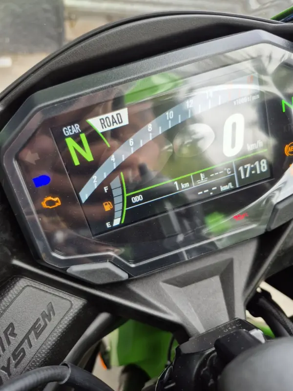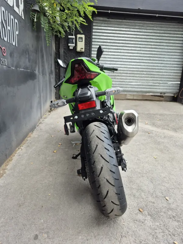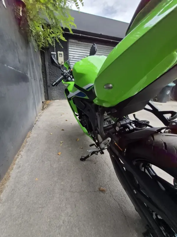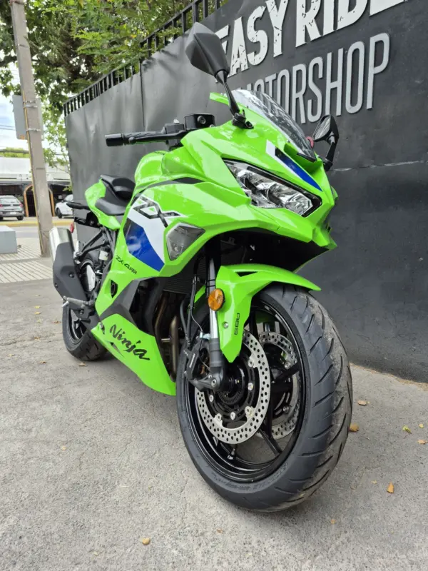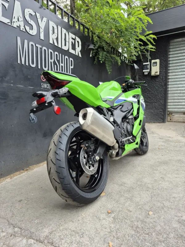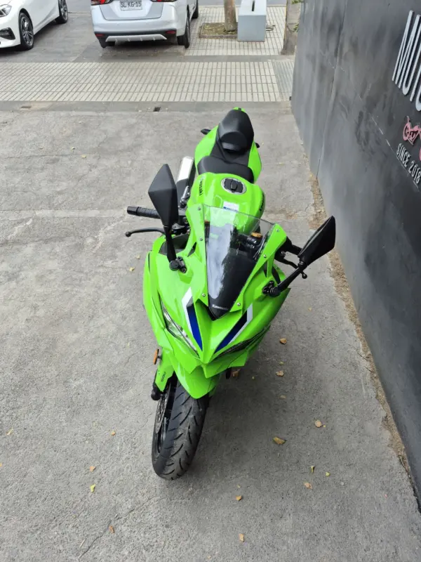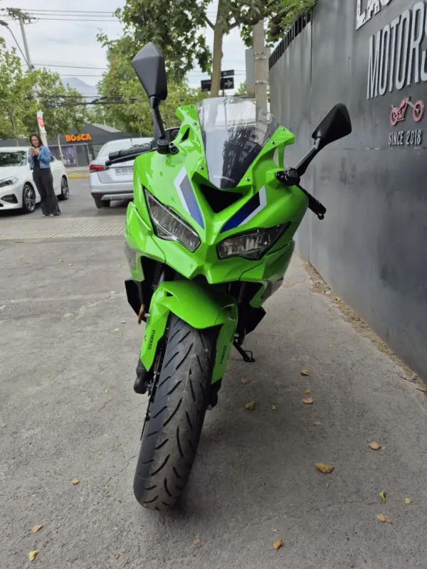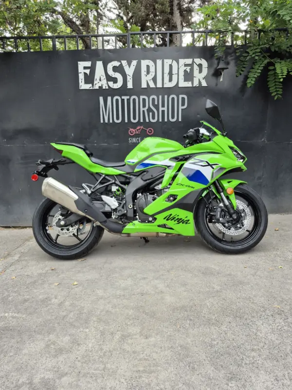 | OBSERVACIONES: | Motor 4 cilindros en línea de 399 cc (≈80 CV, ~36 Nm) con línea roja por encima de 15,000 RPM, transmisión de 6 velocidades y quickshifter bidireccional de serie, suspensión delantera invertida Showa SFF-BP totalmente ajustable y trasera monoshock BFRC-lite, frenos radiales Brembo Stylema con ABS Cornering, chasis trellis de aluminio de perfil bajo, asiento alto (830 mm), tanque de 15 L y peso 188 kg (en seco). Diseño agresivo heredado de la ZX-10R con carenado aerodinámico, luces LED Matrix y alerón doble elevado. Tecnología con pantalla TFT de 5″ con conectividad Kawasaki Rideology, modos de conducción (Sport, Road, Rain, Track + KTRC de 3 niveles) |