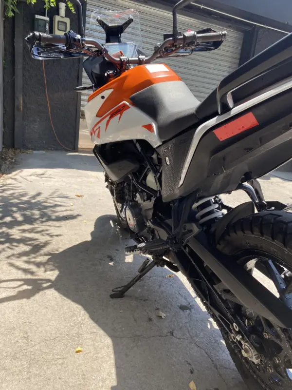 | OBSERVACIONES: | Motor monocilíndrico de 248.8 cc (30 CV, 24 Nm) refrigerado por líquido, con transmisión de 6 velocidades y embrague antirrebote PASC, suspensión WP APEX (delantera invertida de 43 mm y trasera monoshock, ambas ajustables), frenos ByBre con ABS (desconectable en la rueda trasera), chasis de acero multitubular, asiento alto (855 mm), tanque de 14.5 L y peso 167 kg . Equipada con llantas de aleación, cubre cárter, neumáticos todo terreno, protecciones de motor y radiador, pantalla TFT de 5″, protector de horquilla. |