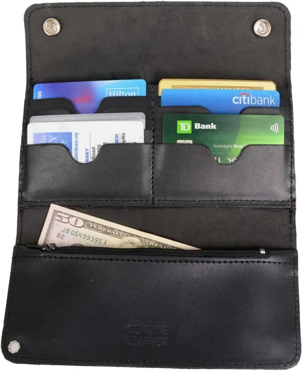 Cartera para jinete con cadena extraíble: nuestra cartera negra para hombre con cadena está hecha de cuero de vaca 100% de grano completo y está diseñada para durar y diseñada con cadena extraíble. Esta cartera de camionero tiene una cadena de acero inoxidable de 14 pulgadas de largo que se engancha de forma segura en la trabilla de tu cinturón y tiene cierres a presión para mayor seguridad.