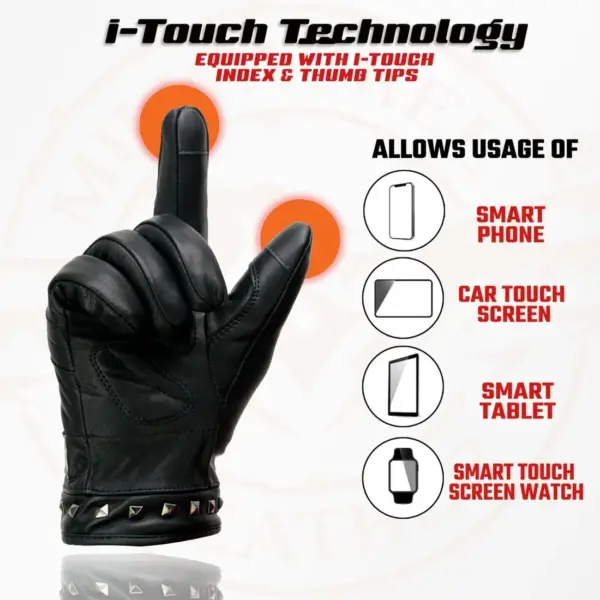 🤘 Fabricados en cuero premium y con dedos con tecnología i-Touch para que puedas usar tu smartphone o GPS sin quitártelos. ¡Además, tienen detalles de tachas para un look único!