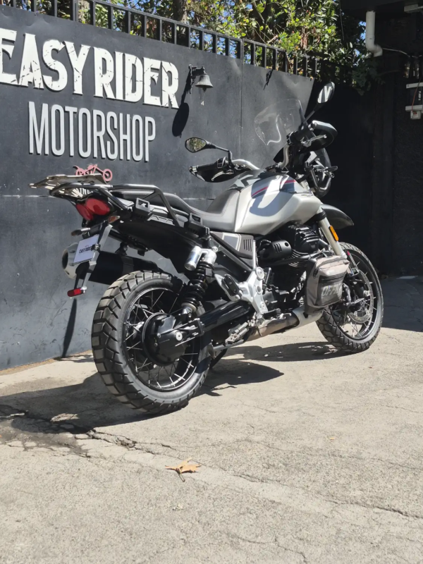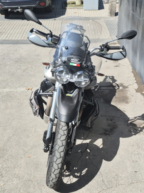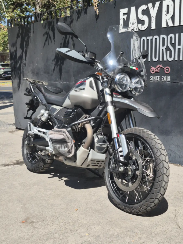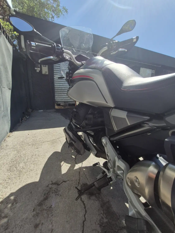 | OBSERVACIONES: | Motor bicilíndrico en V a 90° transversal OHV refrigerado por aire/aceite de 853 cc, potencia aproximada de 80 hp y 83 Nm de torque, inyección electrónica con ride-by-wire, transmisión de 6 velocidades con embrague monodisco y transmisión final por cardán, chasis tubular de acero, suspensión delantera horquilla invertida de 41 mm ajustable y monoamortiguador trasero ajustable, frenos Brembo de doble disco delantero de 320 mm y disco trasero con ABS en curva, control de tracción y modos de conducción, ruedas 19” delantera y 17” trasera, peso aproximado de 230 kg en orden de marcha y estanque de combustible de 23 L |